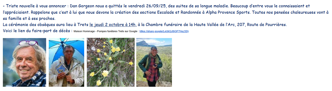 -> Pas de randonnée prévue le jeudi 2 Octobre pour cause de météo et de la cérémonie funéraire suite au décès de Daniel Gorgeon, bien connu au sein d’Alpha Provence et dans le milieu de l’escalade