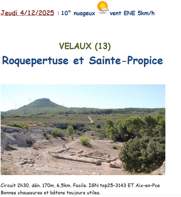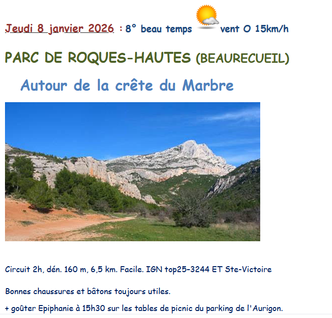 Ce jeudi, nous ferons la dernière sortie de l’année 2025 à Saint-Antonin-sur-Bayon, au pied de Sainte-Victoire. Au départ à...