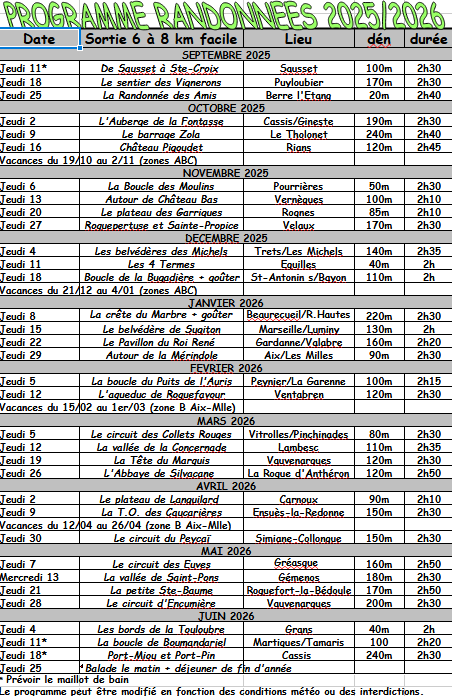 Inscription au plus tard la veille de la randonnée choisie avant midi, auprès de l’Association Alpha par mail de préférence : alphaprovencesports@gmail.com ou SMS à Brigitte (de préférence)
