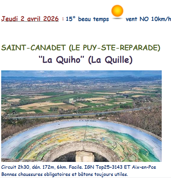 Changement de programme pour ce jeudi : nous n’irons pas à Carnoux (plateau de Languilard) car trop loin, mais à Saint-Canadet au dessus du Puy-Sainte-Réparade, sur la colline du Puech. La Quille (la Quiho en provençal) symbolise les restes d’une ancienne et redoutable place forte, détruite au début du 17e siècle. Cette forteresse, située à 454 m d’altitude, offre une vue panoramique qualifiée d’une des plus belles du Val de Durance. Nous découvrirons au passage la chapelle Sainte-Réparade du Xe siècle, la source de Gacharelle et les vestiges du vieux village. Départ de Saint-Canadet (D13), près de ‘’l’Écurie de Saint Canadet’’ par le chemin de Saint-Pierre (cimetière), le chemin des Pierrettes et le chemin de l’Amandier jusqu’à un bon parking en terre le long de cette petite route, pour éviter de déranger le centre équestre.